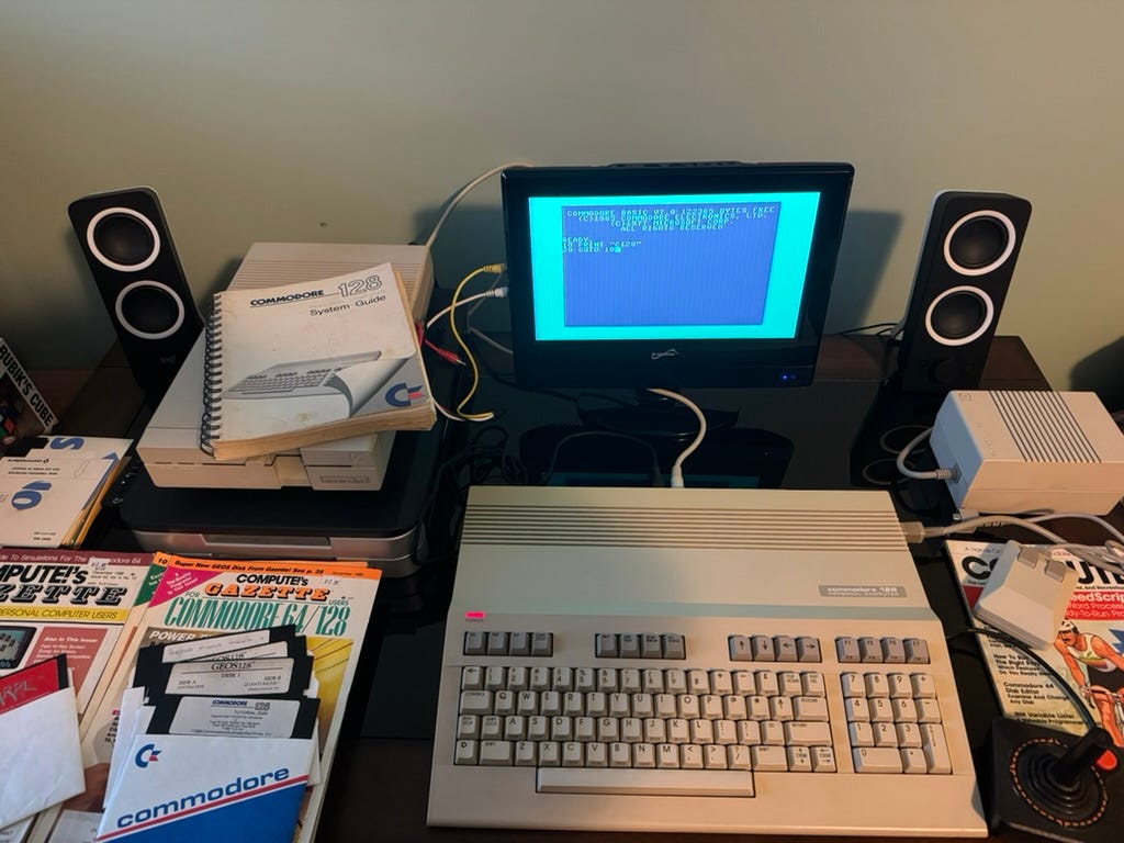 I recently picked up a Commodore 128 (C128) and have it set up in a spare room to put it through its paces. After getting it all hooked up I went through my retro gear to see if I had any Commodore stuff and I was able to dig up some floppies and Compute’s Gazette magazines.