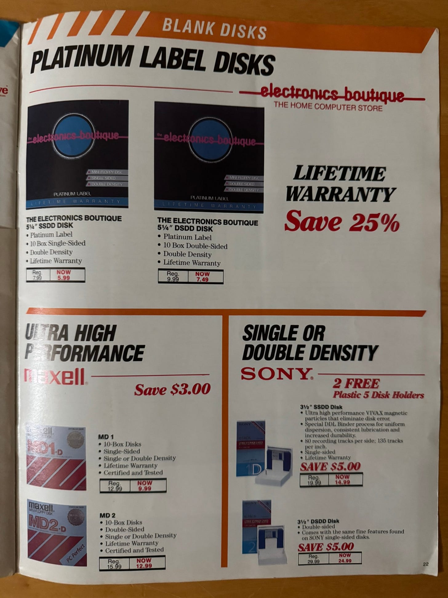 Owning a computer back in the 80s meant you needed floppy disks and Electronics Boutique had you covered. A box of 10 double-side, double-density disks was $12.99 (about $37 in 2025), which seems pretty expensive for a measly 8 megabytes of storage!