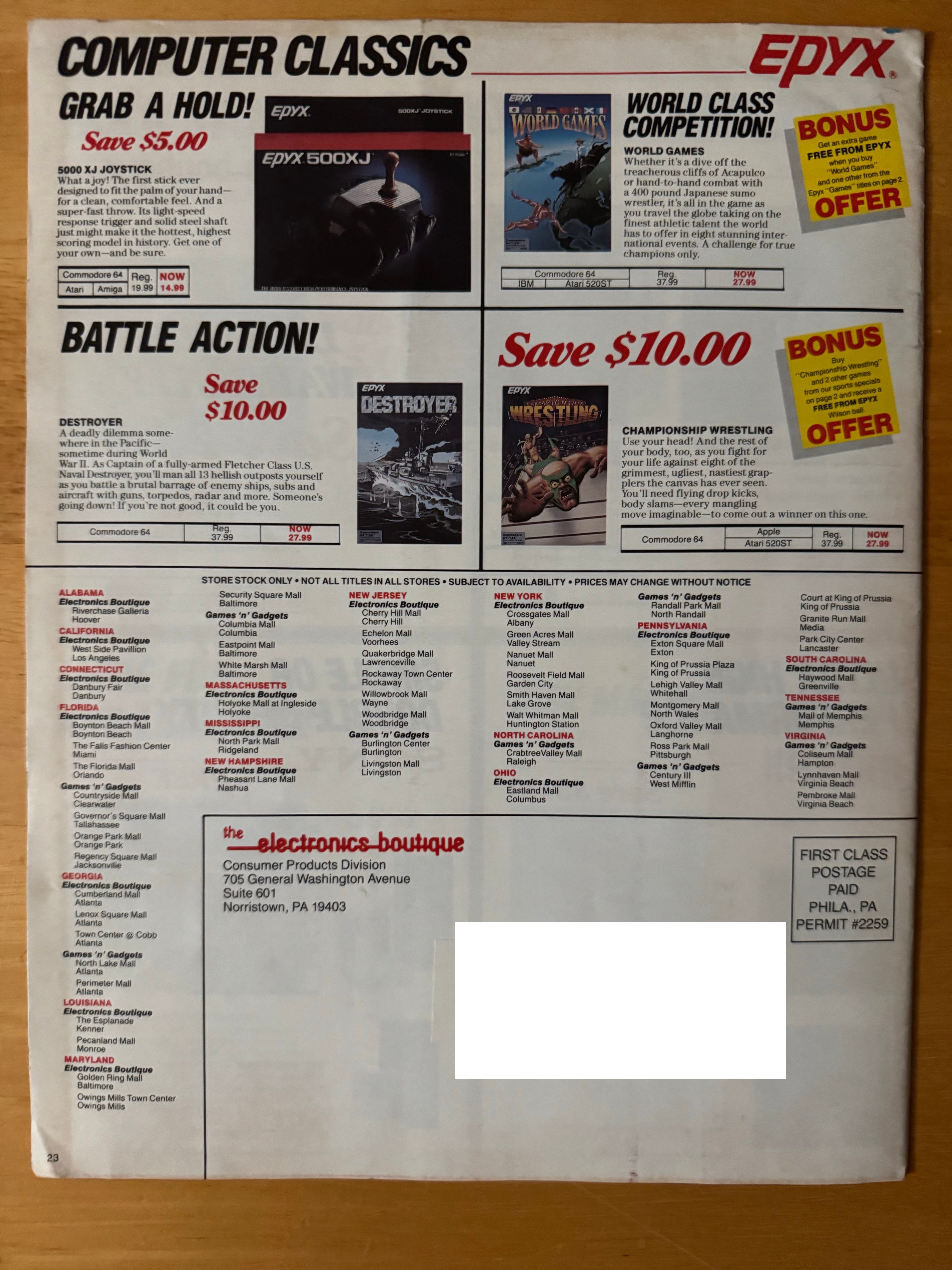 There were other retailers that sold computer software, but they never made it up to me here in Maine. One such place was Electronics Boutique. I recently came across one of their catalogs from 1987 and thought it might be interesting to take a quick look at it.