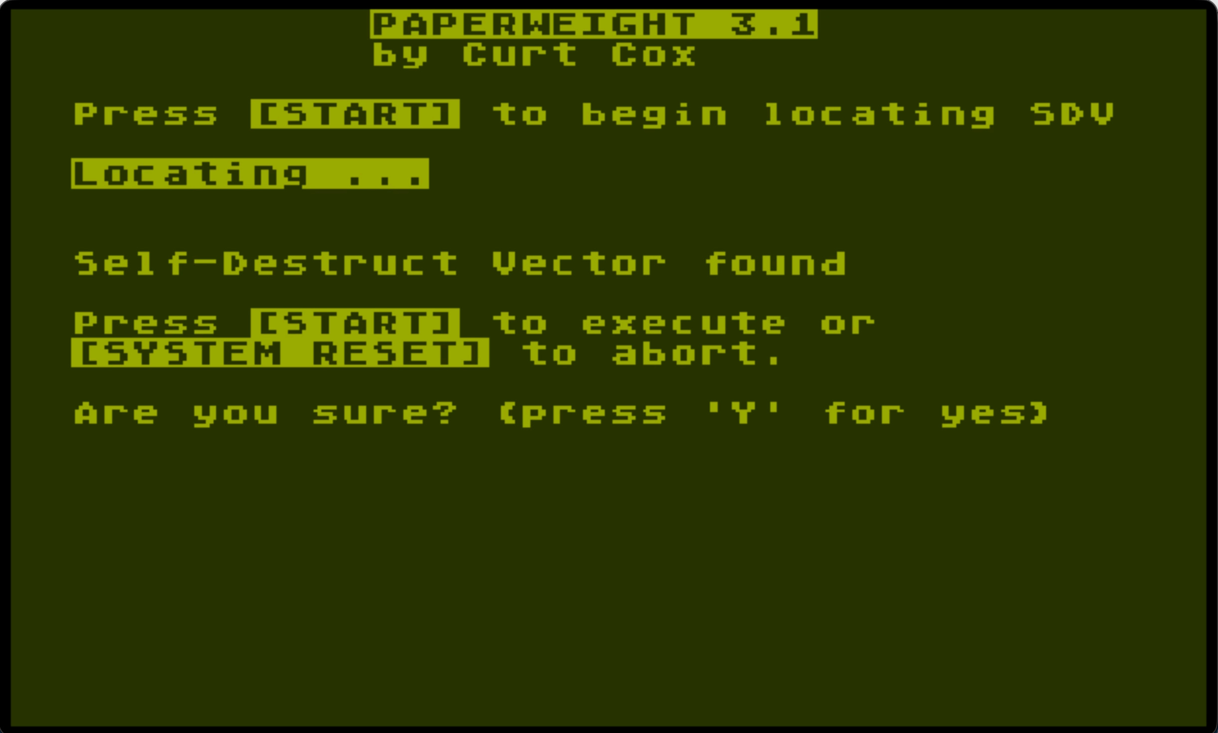 Back in April 1986, ANALOG Computing ran an article on page 113 called Paperweight by Curt Cox. This was a clever machine language submission that, as the article described, used the newly released SDV (Self Destruct Vector) to destroy an 8-bit Atari, turning it into a cool-looking paperweight.