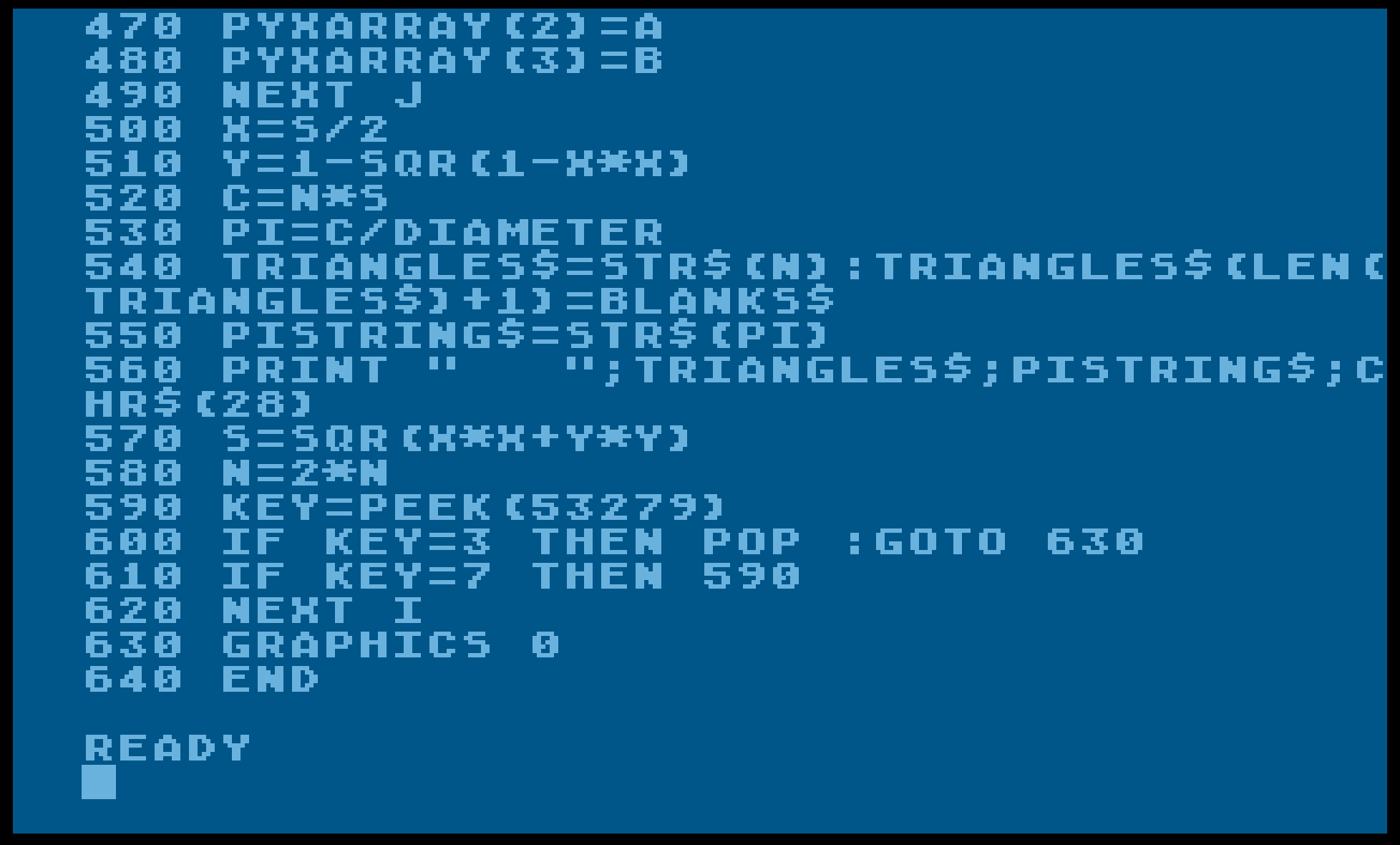 The article has a C version for the Atari ST (one of the first ST listings published by the magazine) and a BASIC version for the Atari 8-bits. I typed it in so that you don’t have to. You can download the XFD with the file, called “CALCPI.BAS” on it.